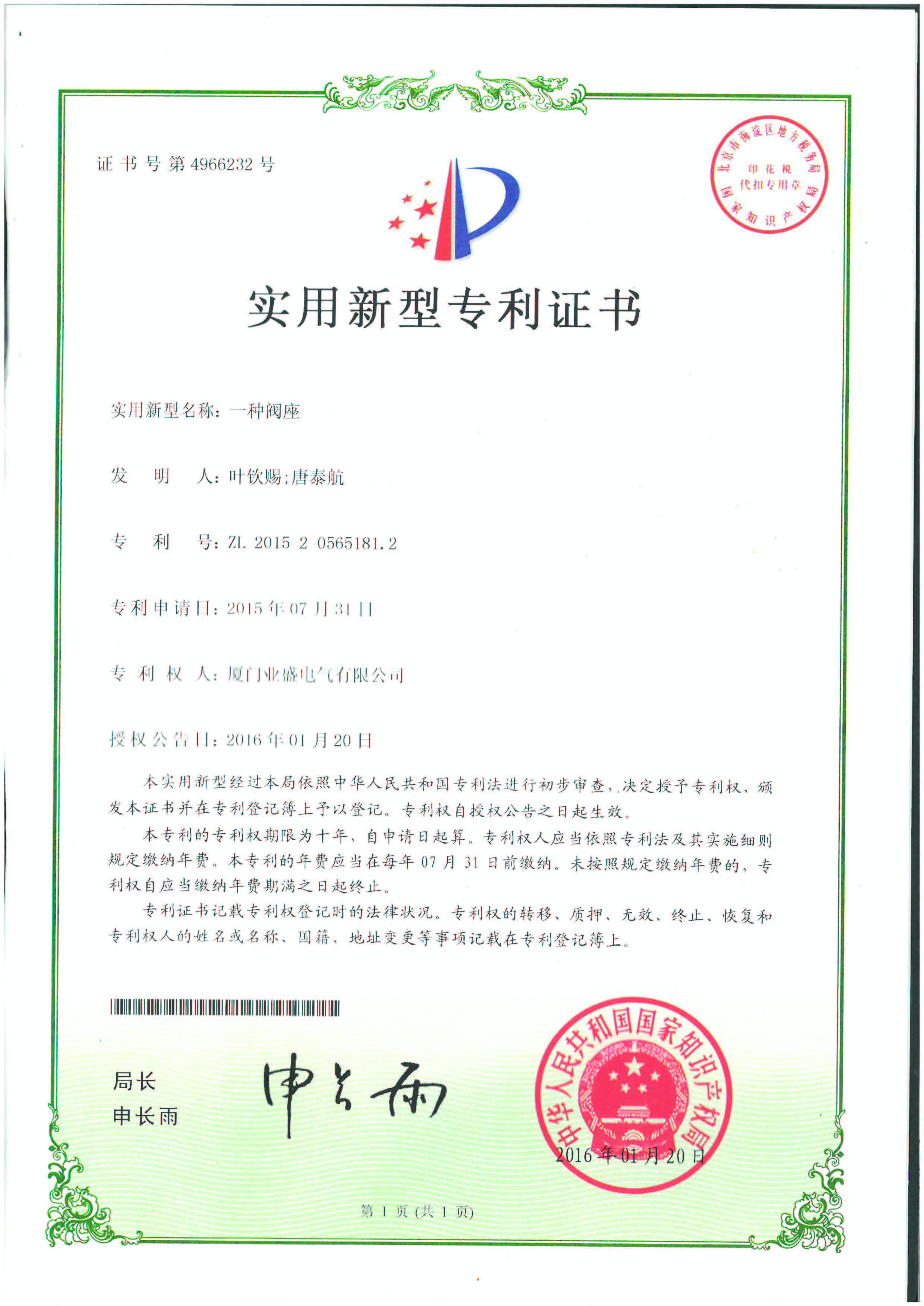 實(shí)用新型專利證書