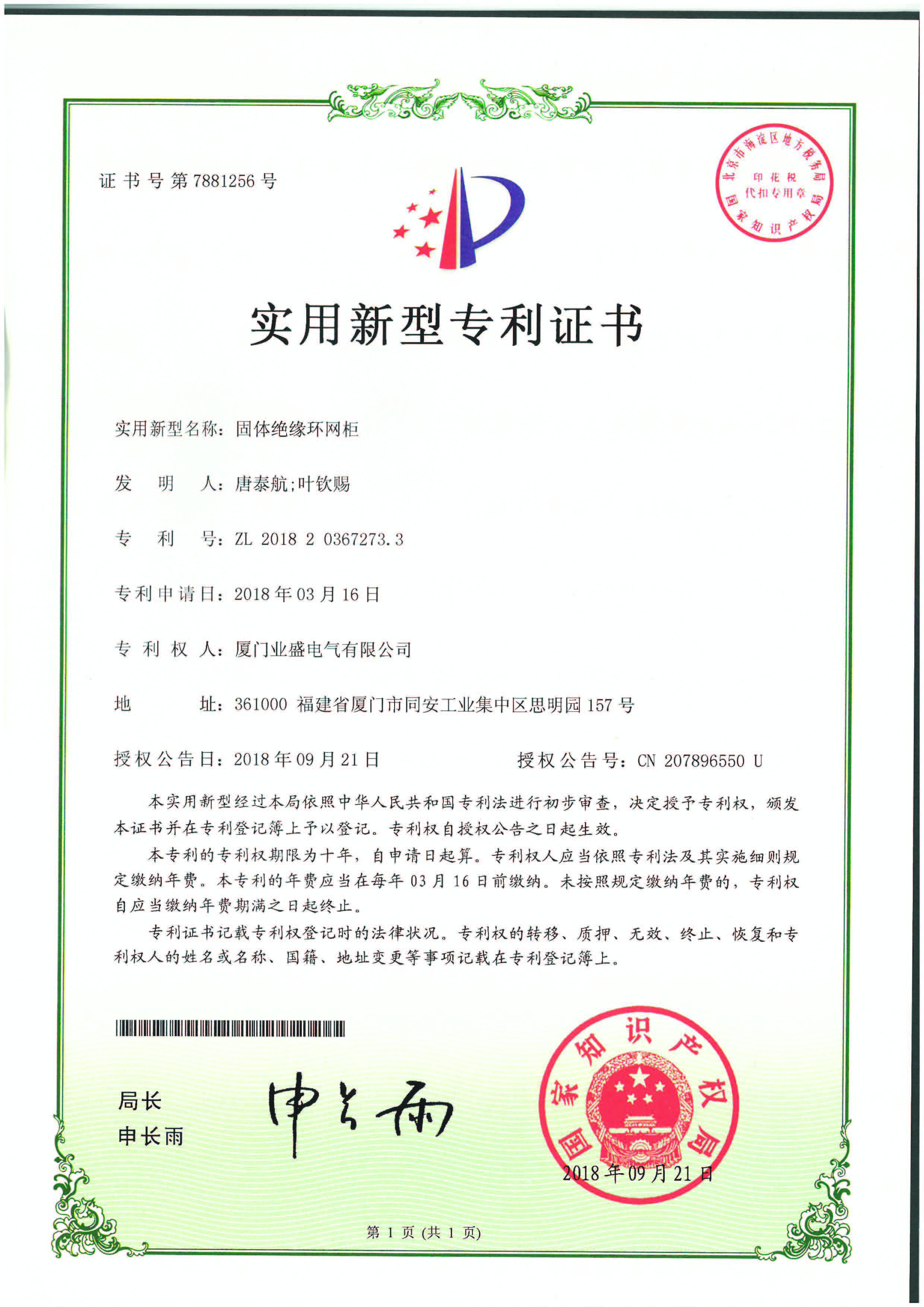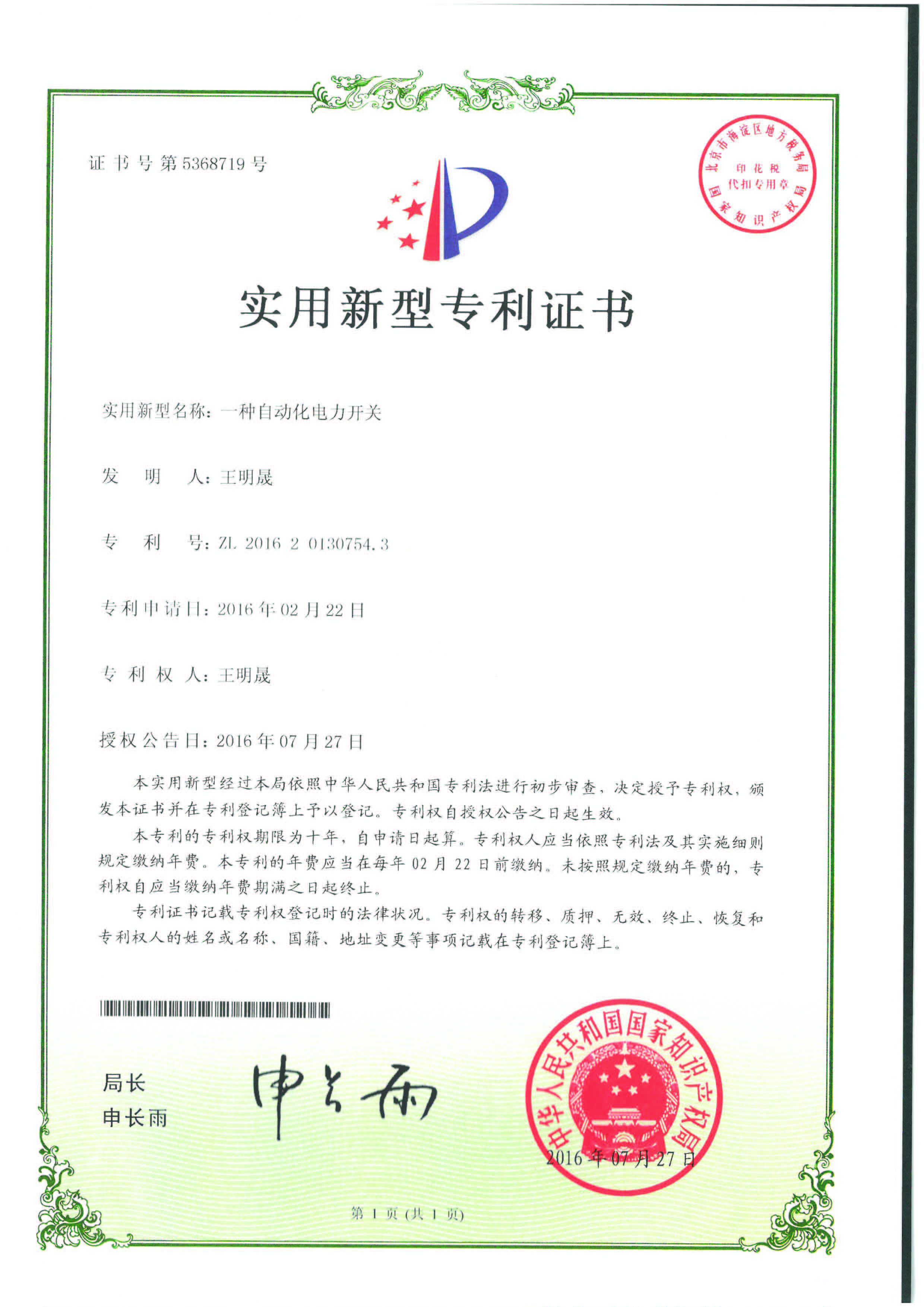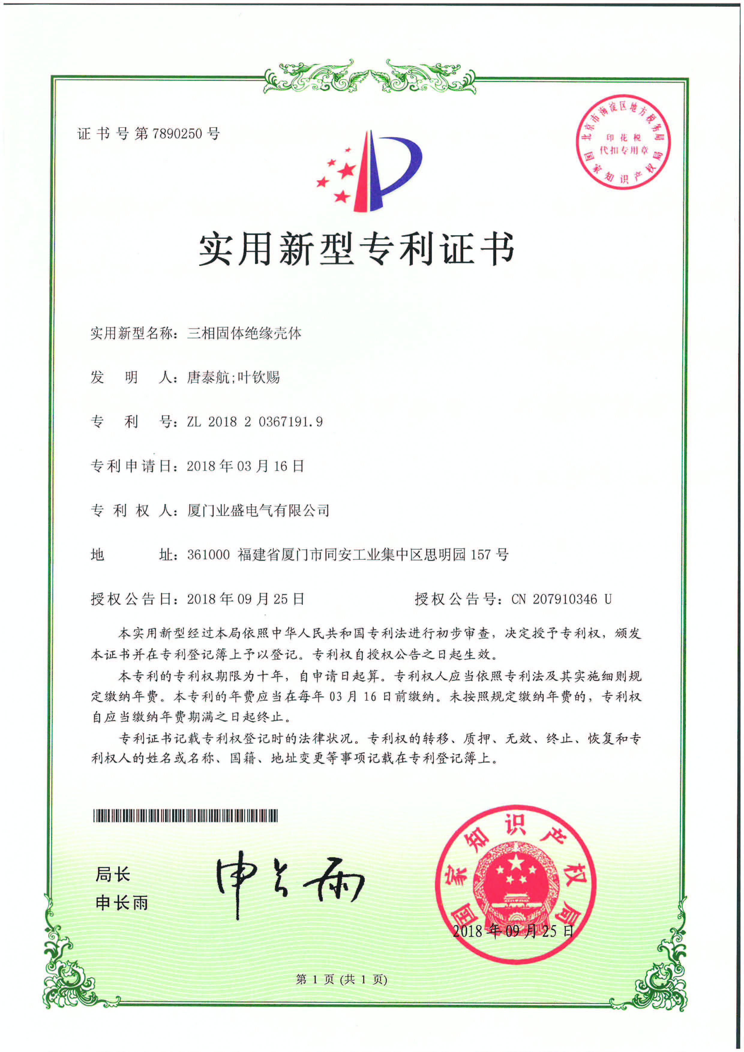 實用新型專利證書