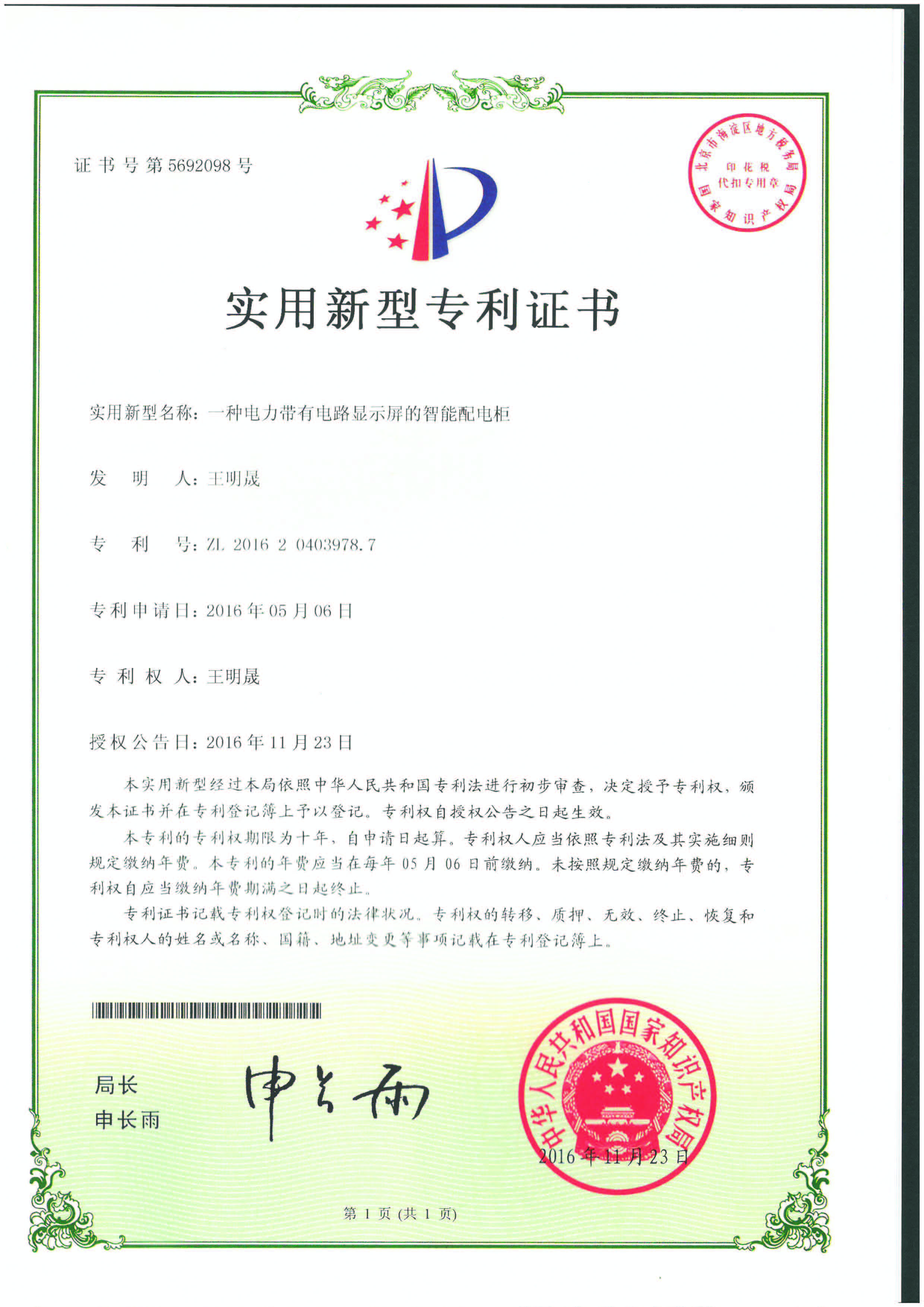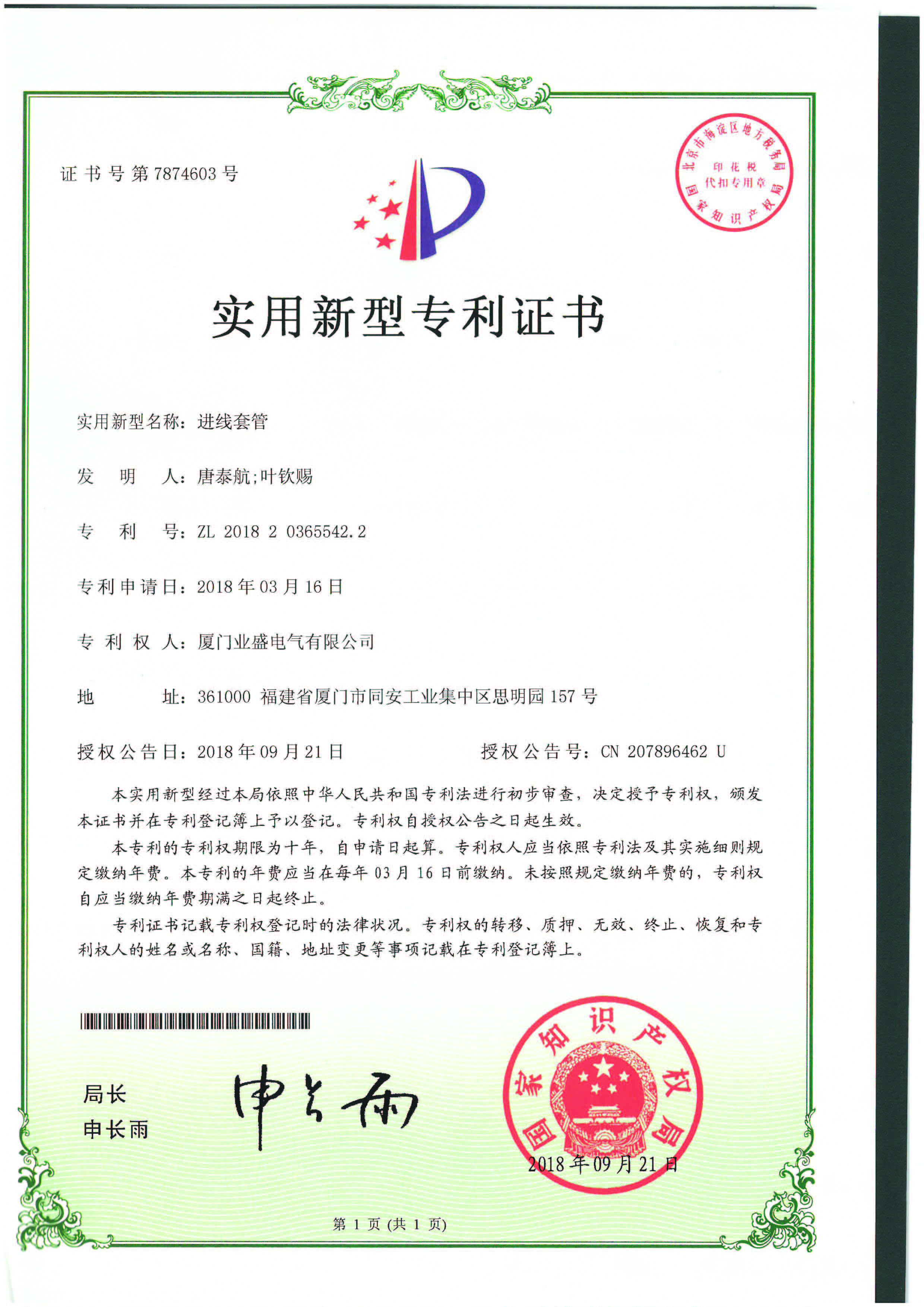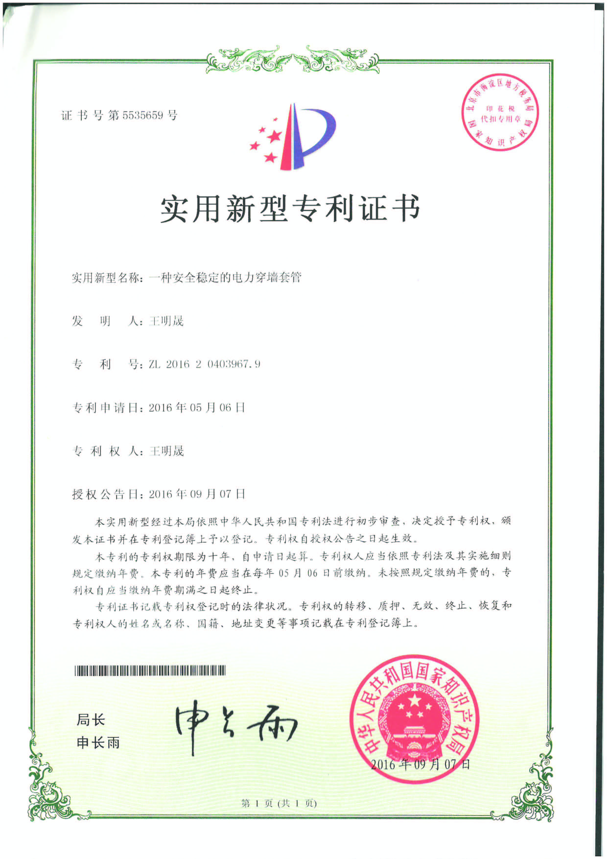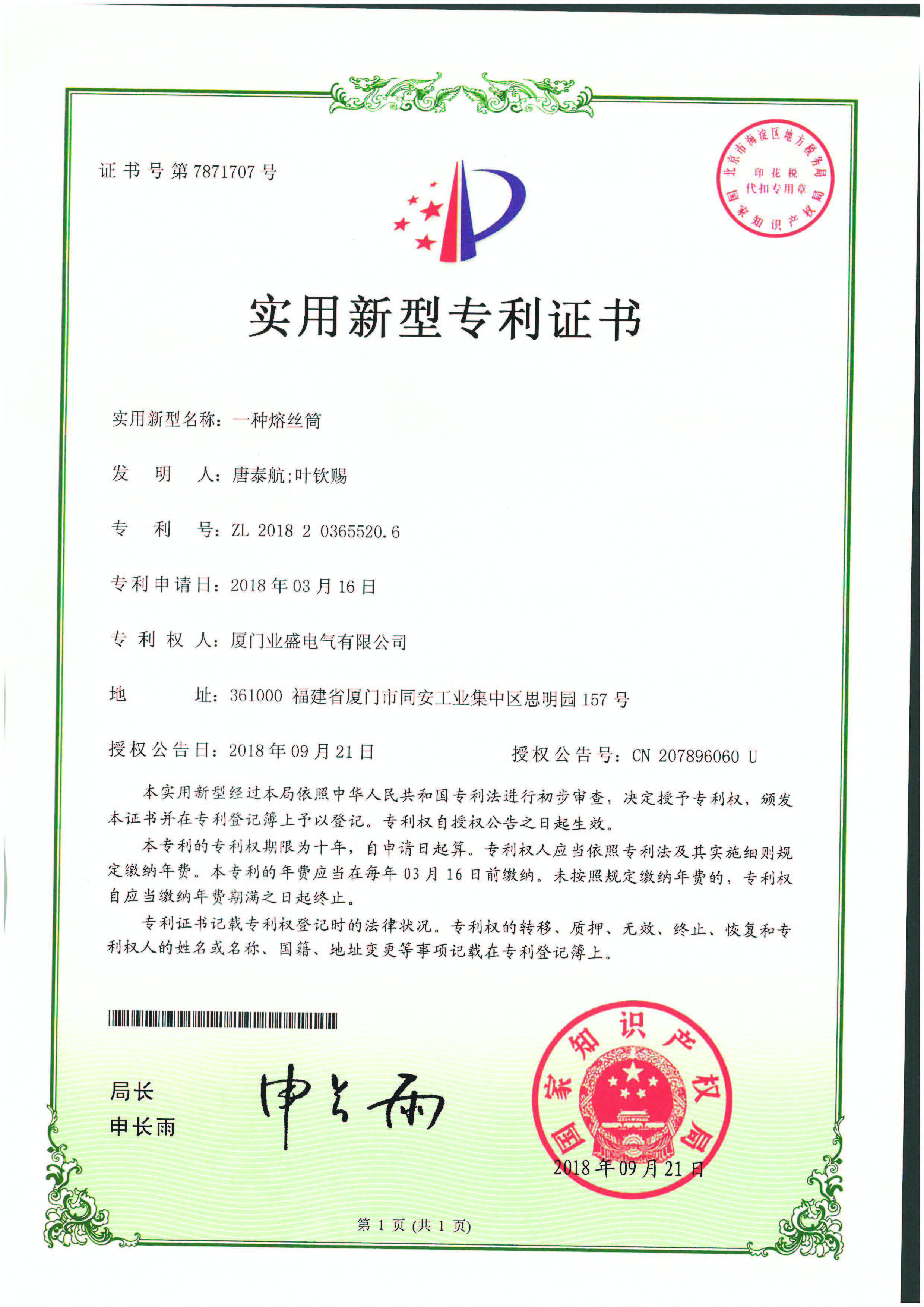 實用新型專利證書